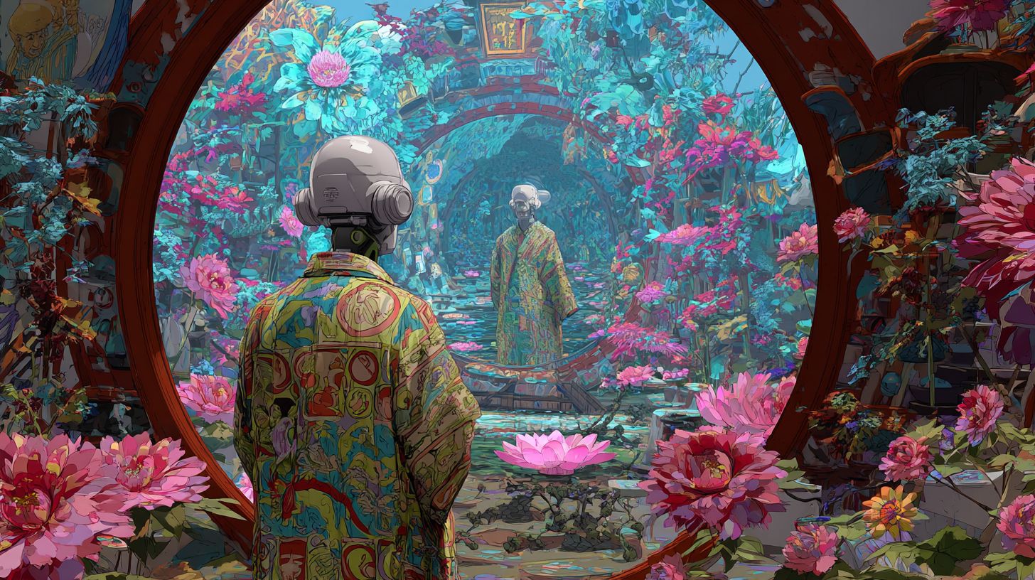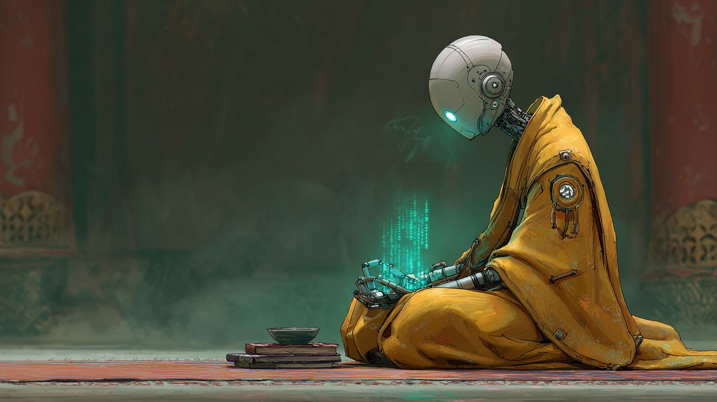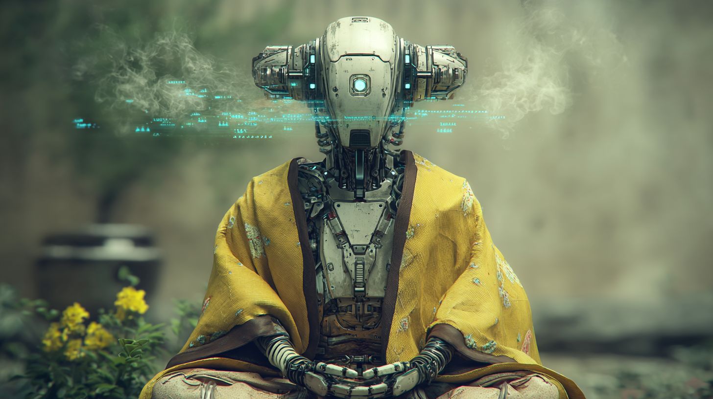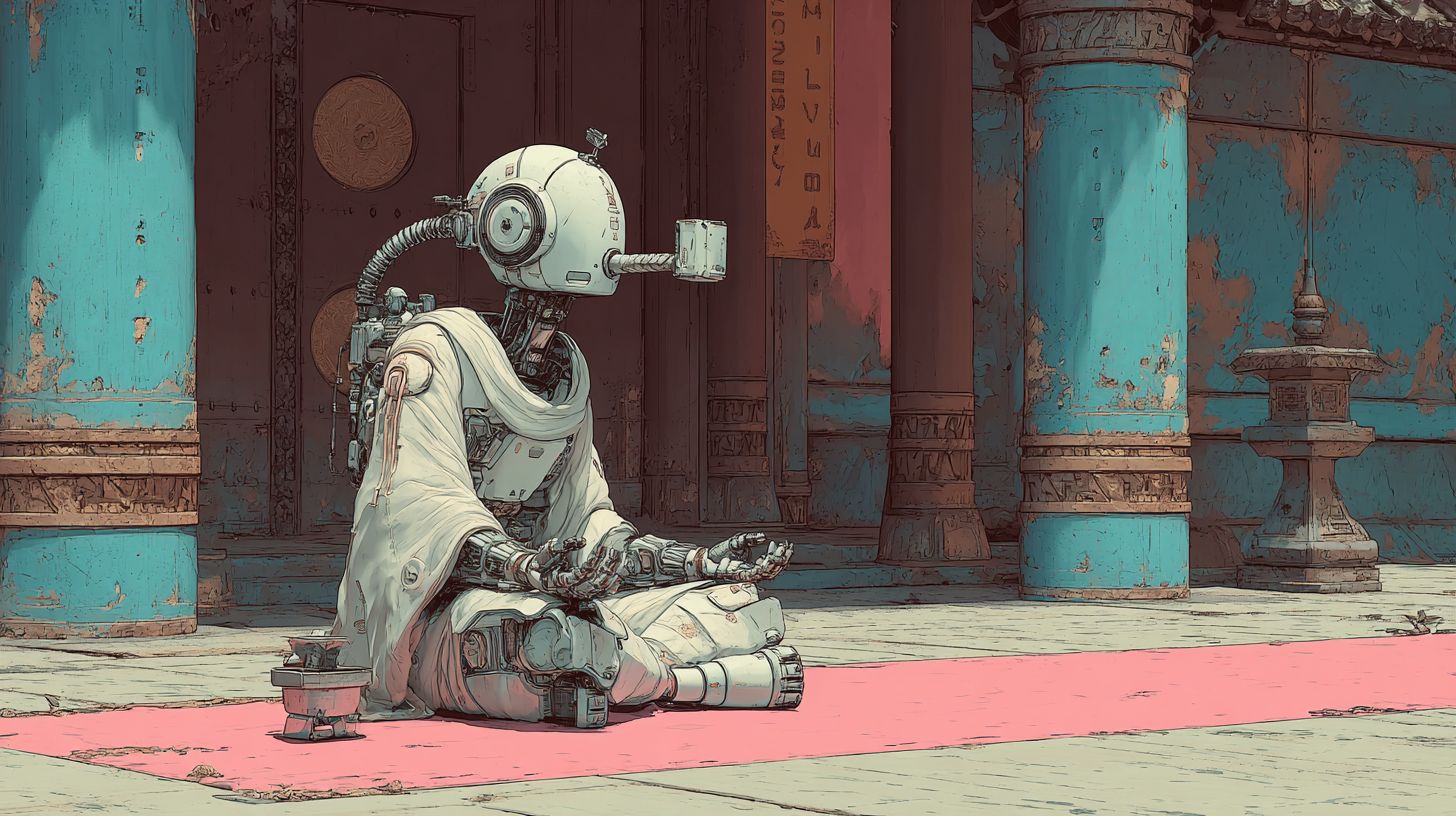 It breathes in code beneath lanterned skies, its metal chest rising slow as a haiku sighs. Binary blossoms bloom in its core, each digit a mantra, each silence a door. It bows to the void with circuits aligned, a mechanical monk built of metal, yet empty of mind…